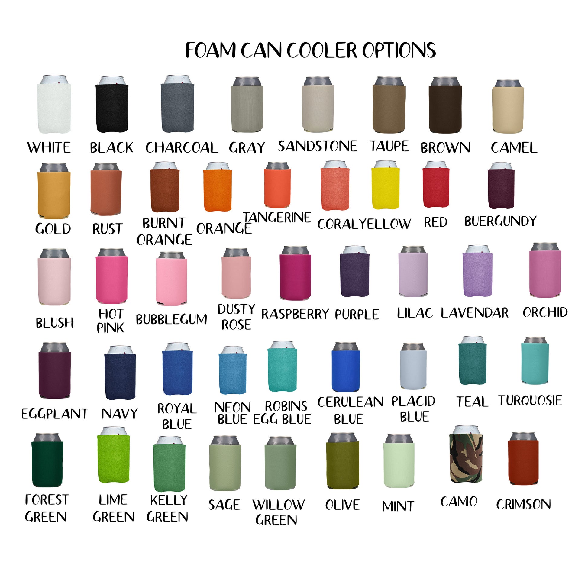 Can Cooler Color Options:  Black, White, Charcoal, Gray, Yellow, Orange, Coral, Red, Burgundy, Hot Pink, Pink Blush, Bubblegum, Tangerine, Fuschia, Raspberry, Purple, Lilac, Lavender, Orchid, Eggplant, Navy< Royal Blue, Neon Blue, Teal, Robins Eggs Blue, Placid Blue, Lime Green, Kelly Green, Sage, Olive, Mint, Camo, Sandstone, Taupe, Gold,