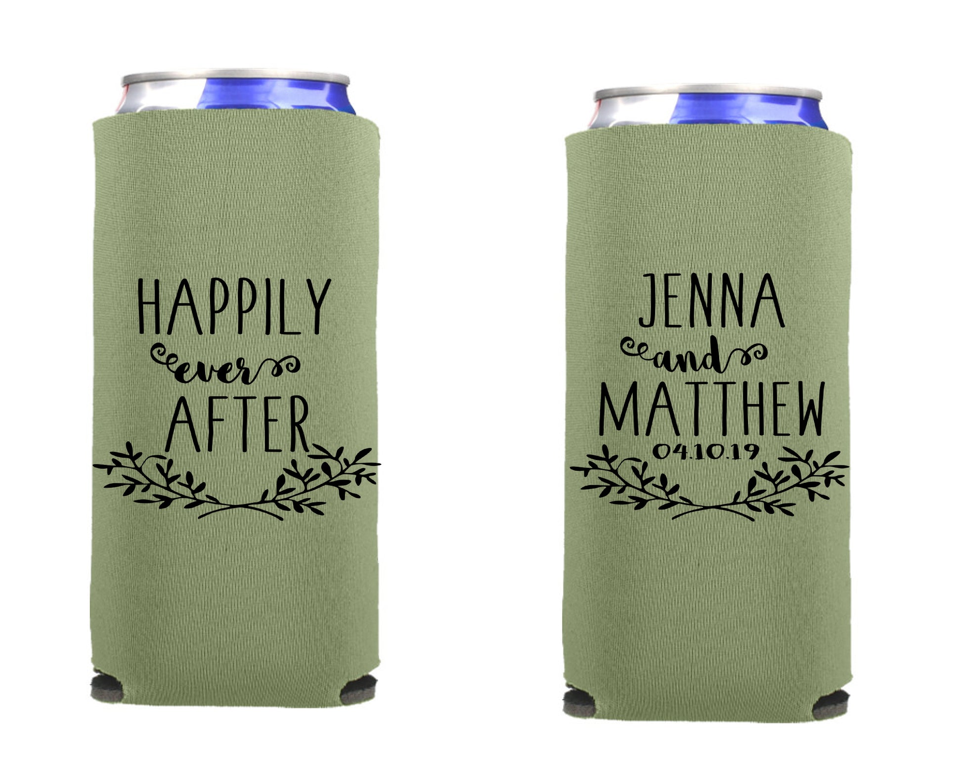 Wedding Can Cooler, Happily Ever After Wedding Reception Favor Screen Printed Skinny Can Cooler. Slim 12 oz. Party Favor